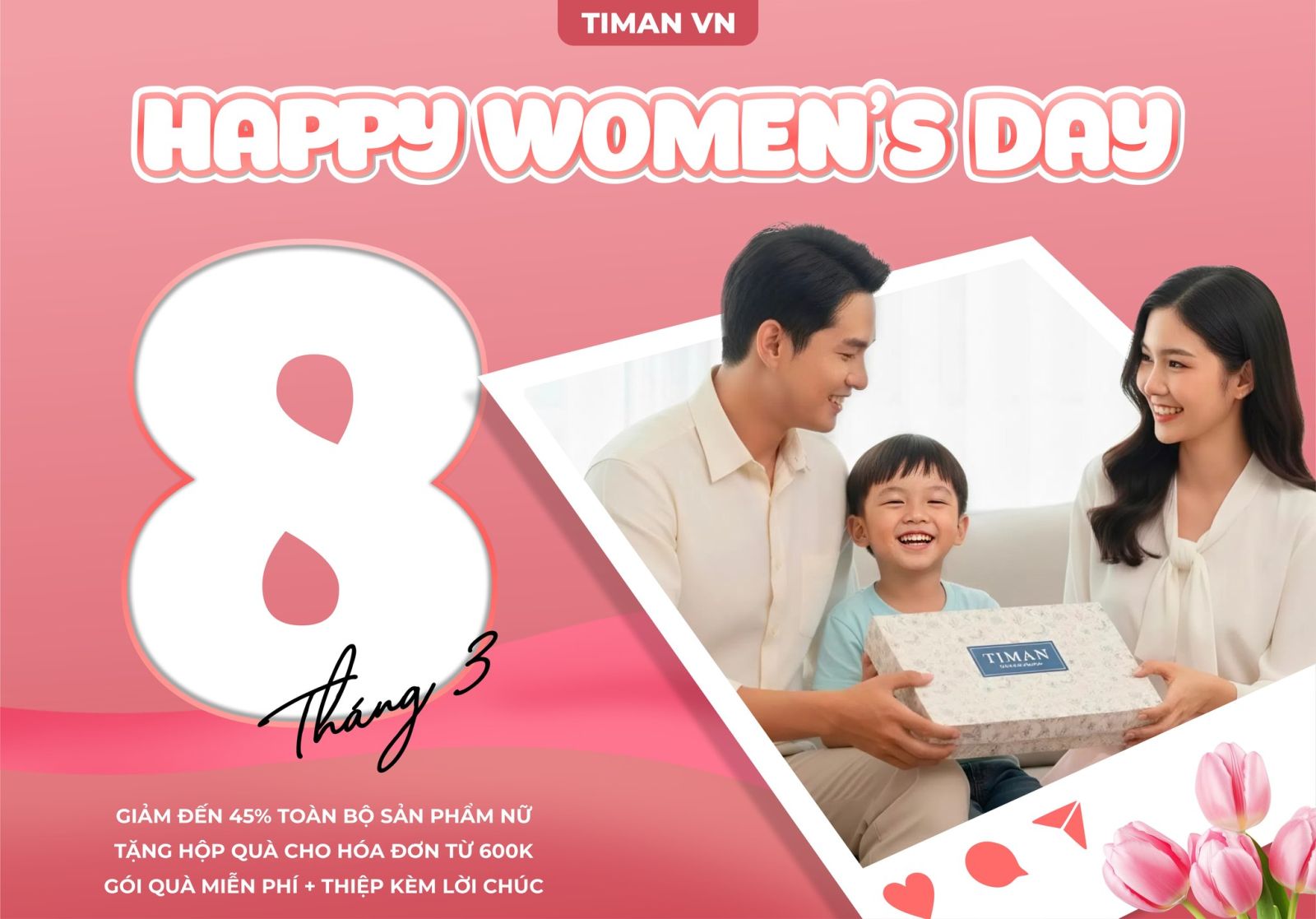 Chương trình ưu đãi mừng Ngày Quốc tế Phụ nữ 8/3 được áp dụng từ 1/3 đến hết ngày 8/3 tại tất cả cửa hàng của Timan.
